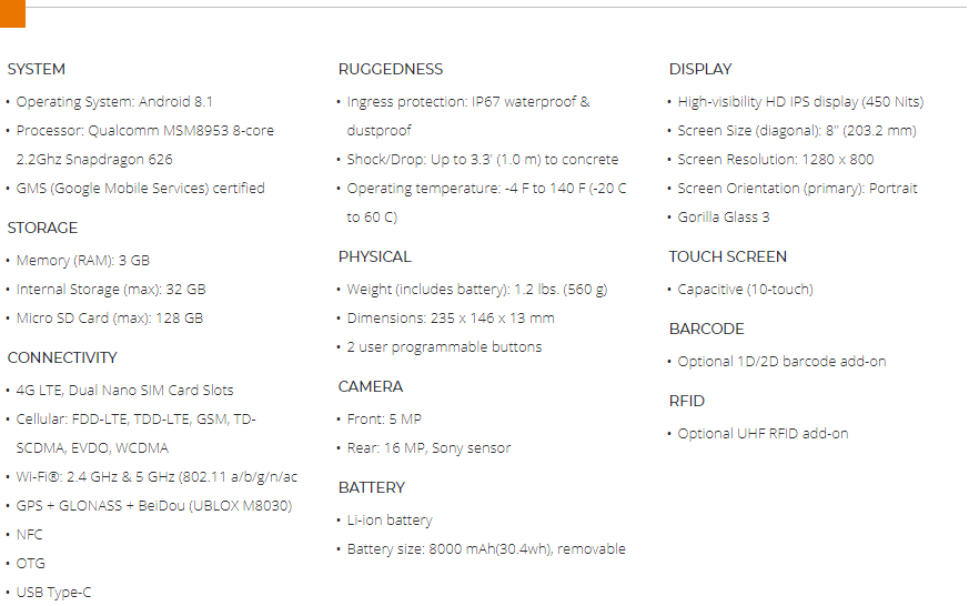 | The CT8 delivers durability at a budget-friendly price. Equip a large crew with the CT8 using Juniper Systems' quantity-based discount pricing or provide a quality product to one or two users. The CT8 is an affordable Android solution that meets rugged data collections needs.